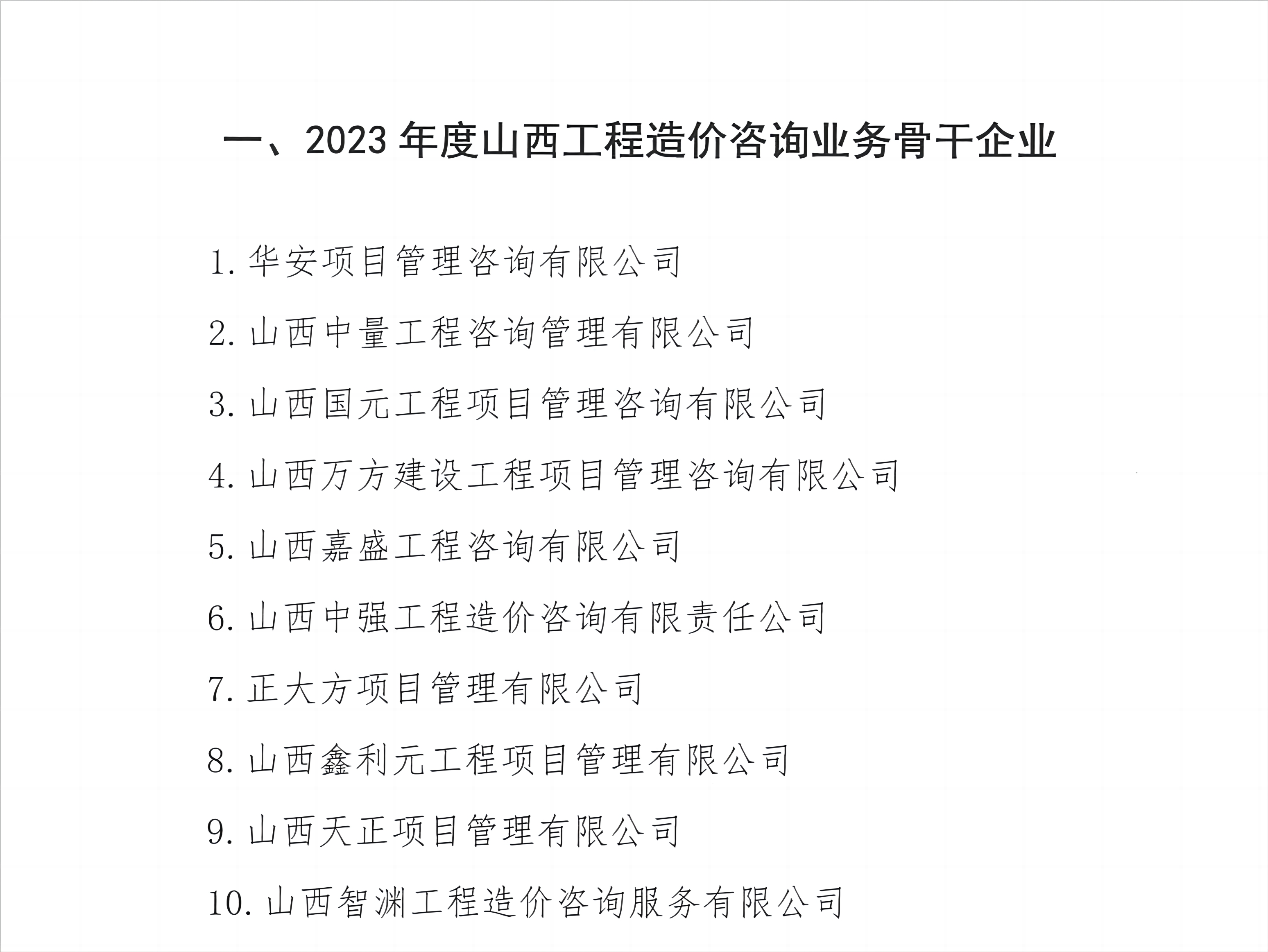 2023年,省價(jià)協(xié)開展2023年度“山西省工程造價(jià)咨詢業(yè)務(wù)骨干企業(yè)”、“山西省工程造價(jià)咨詢應(yīng)用創(chuàng)新領(lǐng)先企業(yè)"活動(dòng),我公司積極參與申報(bào),經(jīng)省價(jià)協(xié)初審、專家評(píng)審,最終,我公司入選2023年度“山西省工程造價(jià)咨詢業(yè)務(wù)骨干企業(yè)”。